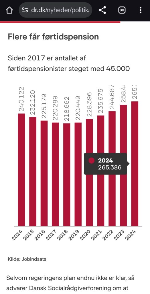 Dvs: i 2014 var der 240.122 på førtidspension ud af 5.627.235 borgere. Det svarer til 255345 ud af 5.984.000. Der var i 2024 265386.* - Det betyder altså, at der reelt kun har været en stigning af førtidspensionister i befolkningen på 0,15%. Det er så lidt, at det nærmest er et naturligt udsving.